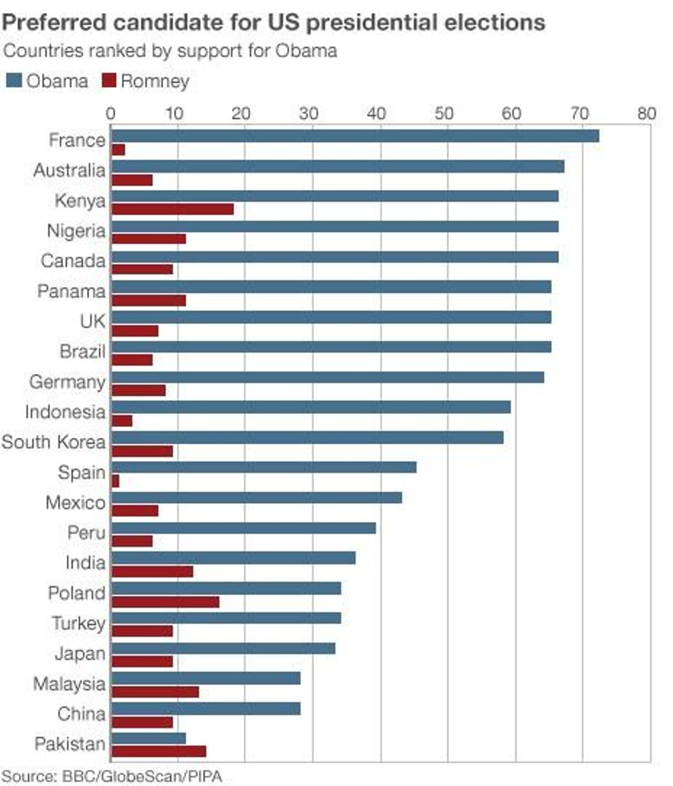 Looking at all the survey results, an average of 50% favored Obama compared to 9% for Romney. The highest support for Obama was in France followed by Australia.