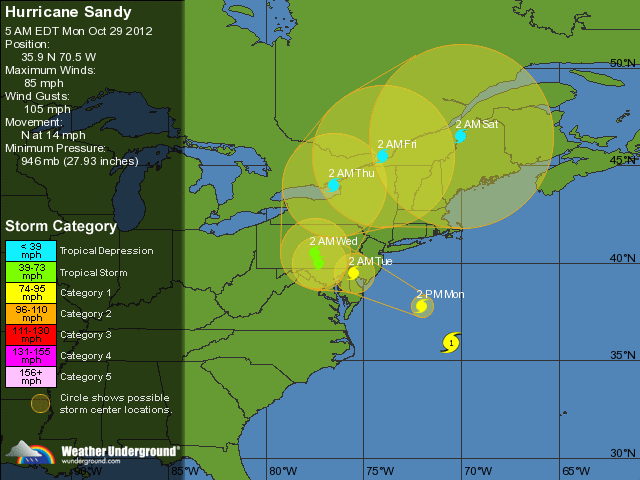 1). Storm surge: we expect the worst storm surge flooding out ahead of Sandy to take place late morning, again late evening on Monday, coinciding with high tide (and a full moon Monday PM hours). Tides are already 2-3 feet higher than average due to astronomical conditions - Sandy's sustained winds and low pressure (28.25") will create a dome of water that will be pushed ashore in two major surges: 9 am - noon, again 9 pm - midnight Monday.