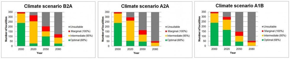 In the area analysis, the best outcome was a 38% reduction in suitable growing regions and the worst case was a 90% reduction by 2080.