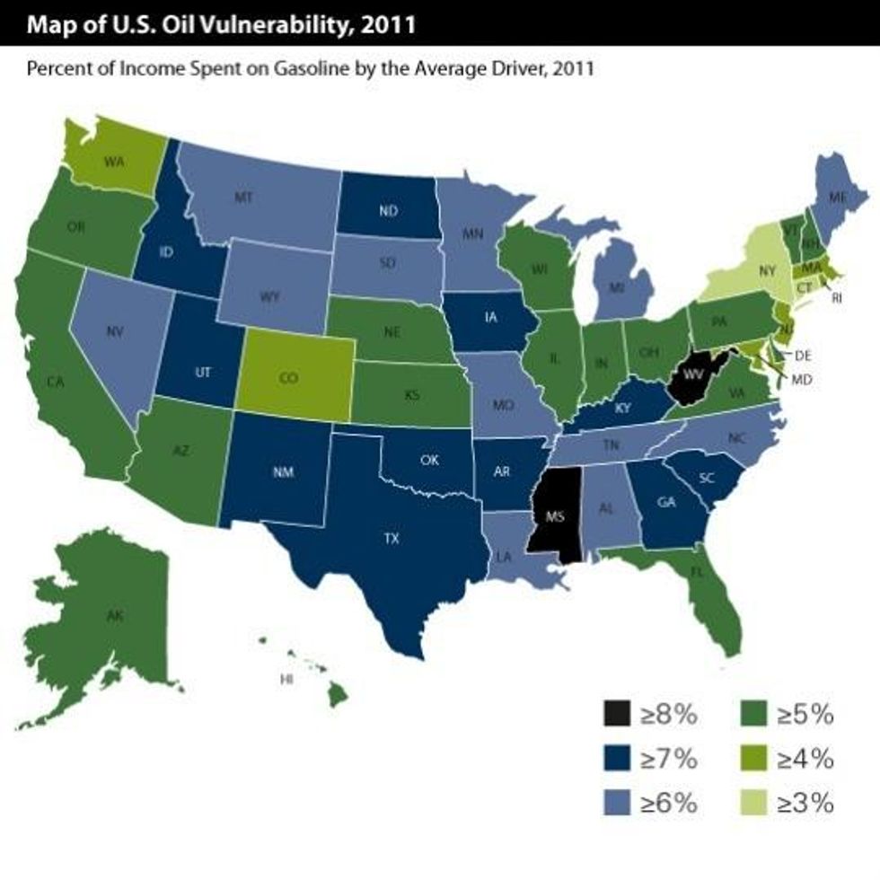 Drivers in more rural states, where public transportation and other clean energy initiatives are typically harder to come by, are twice as dependent on fossil fuels and thus pay twice as much as a percentage of their incomes for gas, compared to drivers in other more urban states.