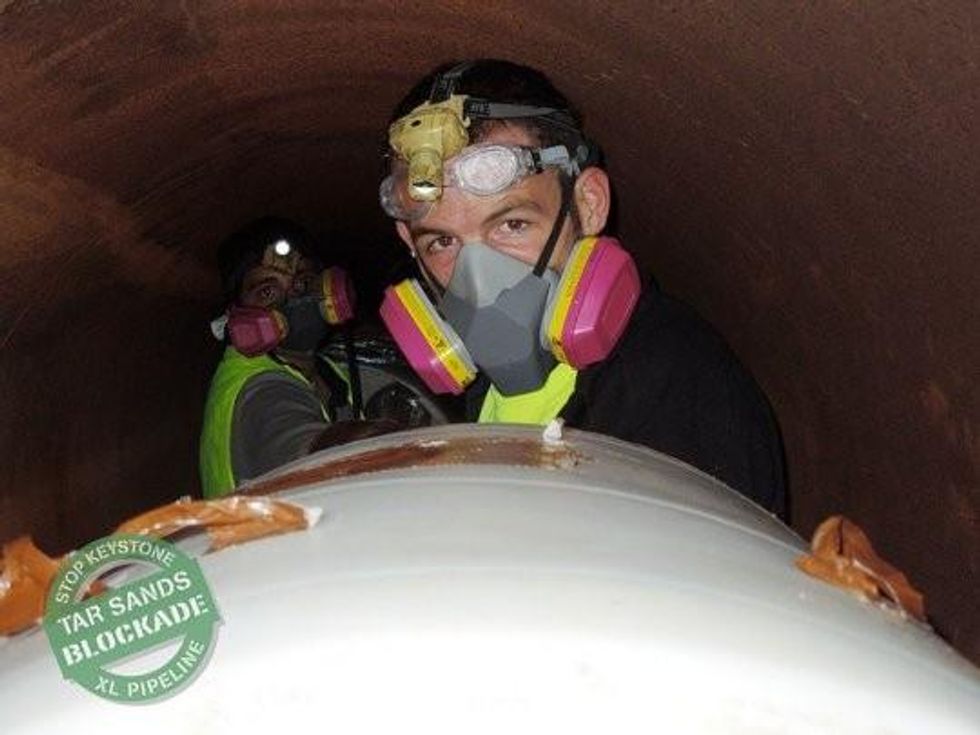 The direct action by two activists with Tar Sands Blockade, Matt Almonte and Glen Collins, is part of an ongoing series of actions aimed at stopping the construction of the TransCanada's tar sands-carrying Keystone XL pipeline.