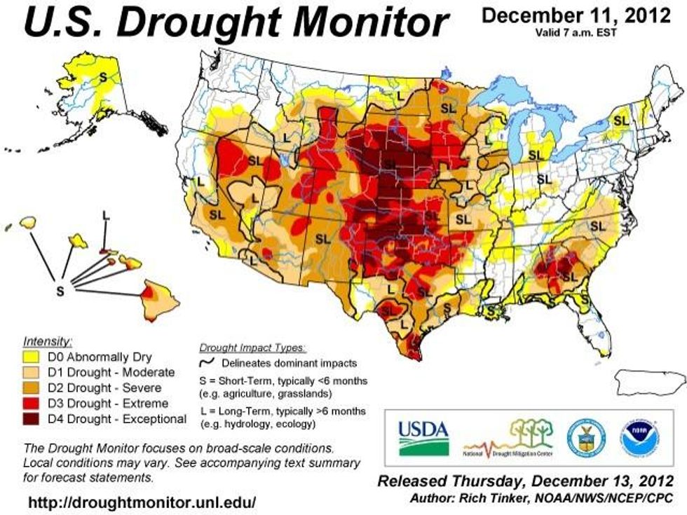 The most recent Drought Monitor from the National Oceanic and Atmospheric Administration (NOAA) shows nearly 62% of the contiguous United States under moderate to exceptional drought.