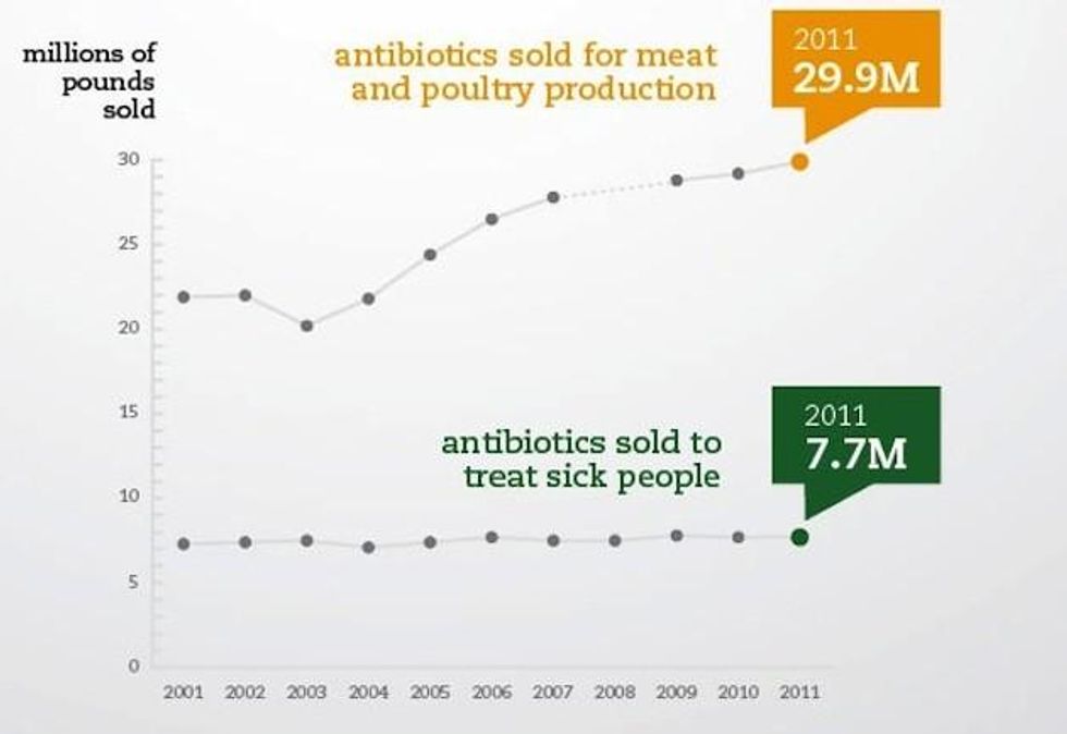The report, which is based on new data released by the Food and Drug Administration, shows that antibiotics used in the big-ag industry to make livestock grow faster and resist bacteria in unsanitary living conditions, broke all previous records--a practice which is drastically contributing to the emergence of drug-resistant superbugs that render many antibiotic treatments for humans useless, the report points out.