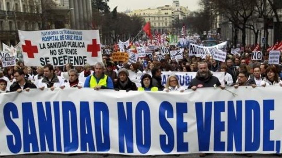 As AFP reports, the Rajoy government has slashed "health spending by seven billion euros ($9.1 billion) a year as part of a campaign to squeeze 150 billion euros out of the crisis-racked country's budget by 2014."