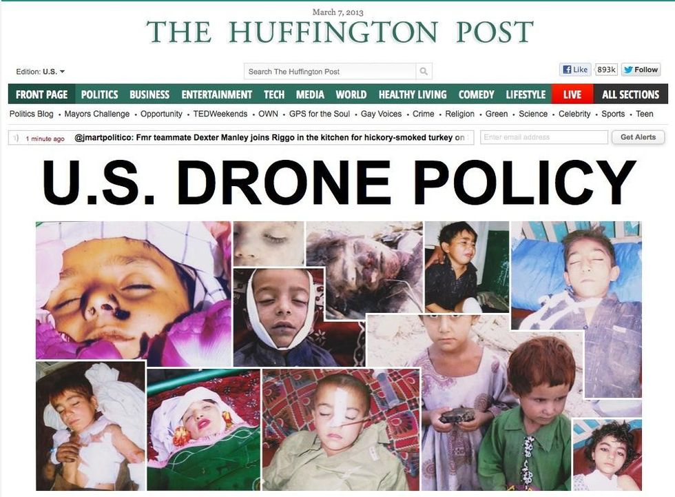 In an editorial decision clearly designed to provoke emotion and bring attention to the often ignored death toll of innocent people--especially children--killed by missiles from US drones in recent years, the Huffington Post on Thursday used its masthead to show grim pictures of dead or wounded child victims of a program widely defended by the president, politicians from both parties, and the military.