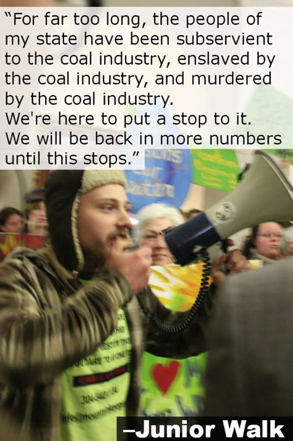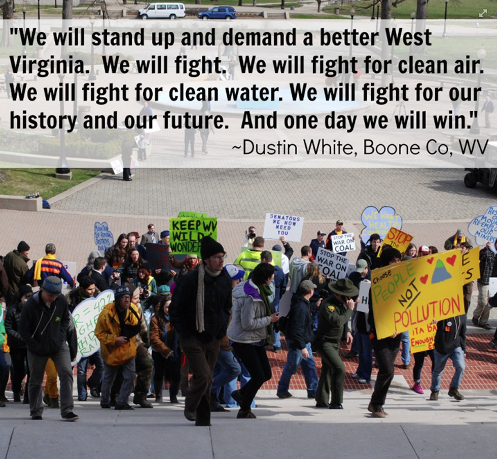 Taking the megaphone, Dustin White of Boone County declared, "It is not our patriotic duty to die for gas or coal. We will stand up and demand a better West Virginia. We will fight. We will fight for clean air. We will fight for clean water. We will fight for our history and our future. And one day we will win."