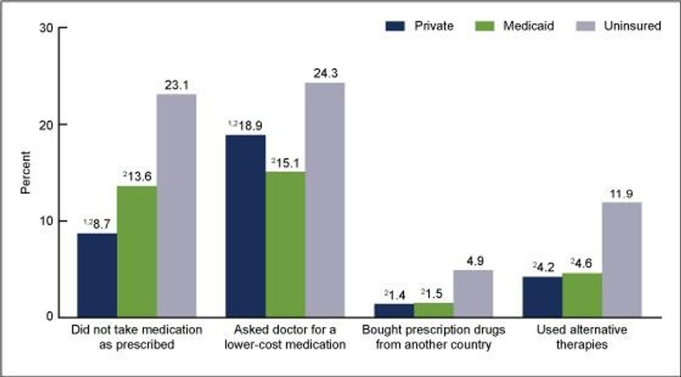 Outlining the findings from their 2011 National Health Interview Survey, the Centers for Disease Control and Prevention (CDC) state that many adults are not taking medicine as prescribed--either skipping doses, delaying prescription refills or taking less medicine--as a way to save money, which the CDC says can lead to "poorer health status and increased emergency room use, hospitalizations, and cardiovascular events."