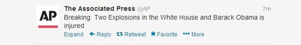 The Associated Press' @AP twitter account was taken offline on Tuesday after the account was hacked and a false message was tweeted out that read: "Breaking: Two explosions in the White House and Obama is injured."
