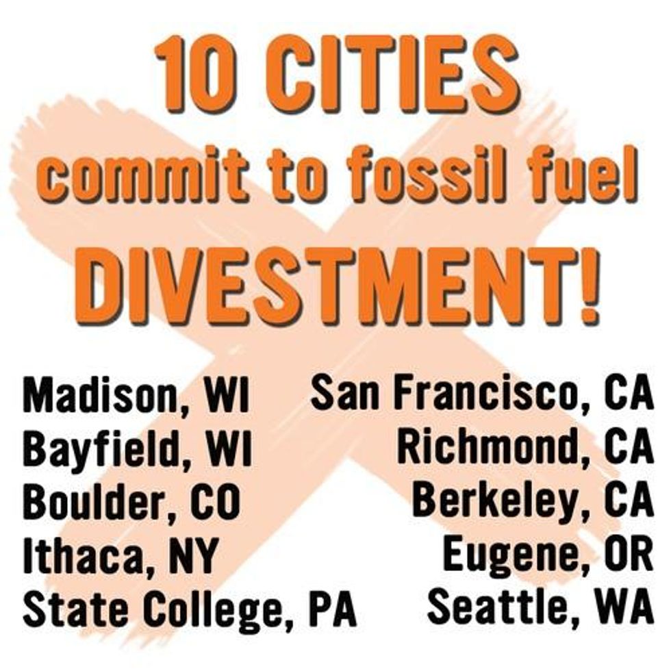 According to 350.org, Seattle joins Madison, Wis., Bayfield, Wis, Ithaca, NY, Boulder, Colo., State College, Pa, Eugene, Ore., Richmond, Calif., Berkeley, Calif., and San Francisco in divesting from the top 200 fossil fuel companies.