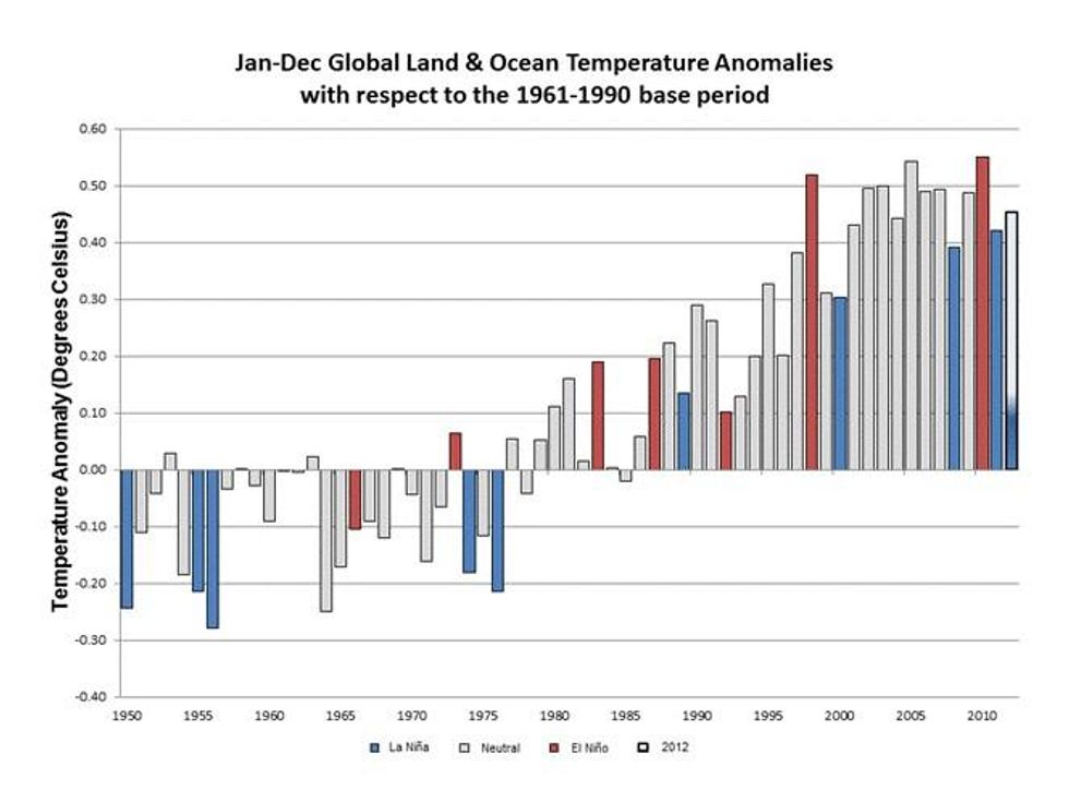 2012 was also the 27th consecutive year global land and ocean temperatures were above the 1961-1990 average.
