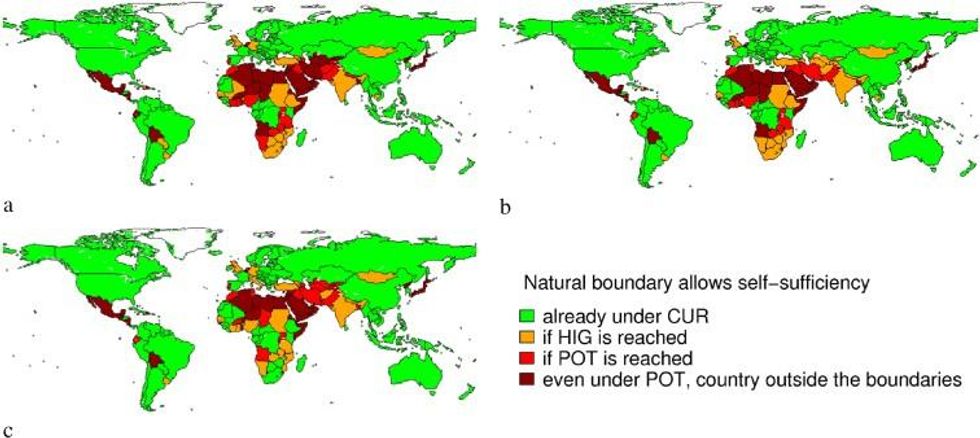 As the image below from the study shows, 16% of the world's population--950 million people--is currently dependent on other countries for their agricultural demands: