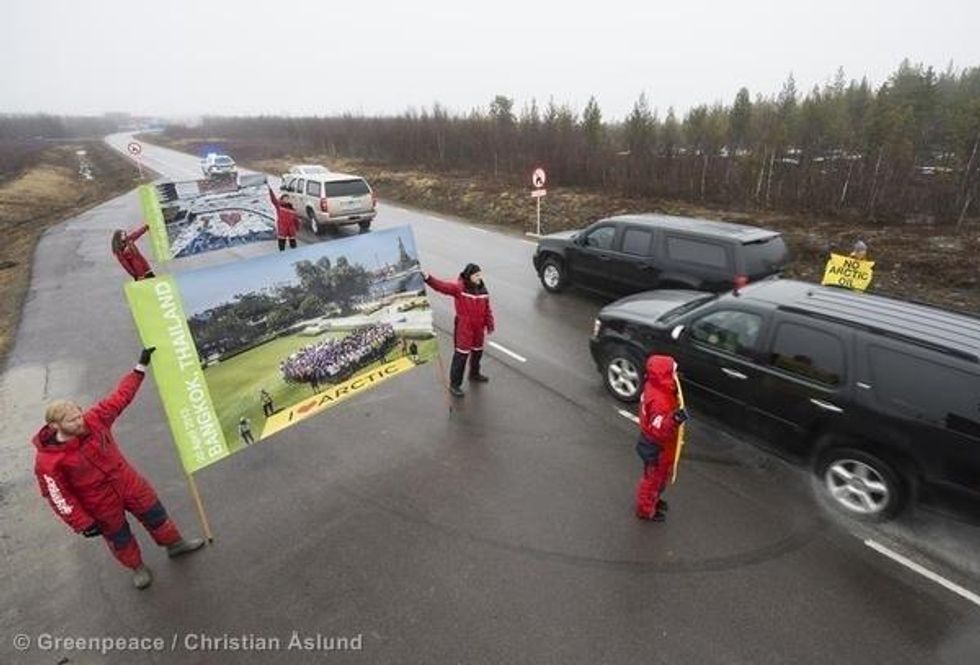 "We will not stand by and let the Harper government use the next two years to advance its destructive industrial agenda at the Arctic Council," said Christy Ferguson of Greenpeace, which staged a concurrent demonstration outside of Canada's parliament Wednesday calling on Prime Minister Stephen Harper's government to ban oil and gas drilling in the Arctic.