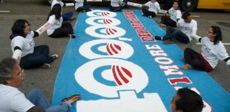 Seated around a banner emblazoned with Obama campaign logos and the number 400,000--representing the number of people scheduled to be deported this year under a White House quota--the dozen activists formed a human chain, their arms linked inside plastic pipes, and sat down in the street outside the Chicago Hilton where the president in scheduled to attend a campaign fundraiser in the evening.