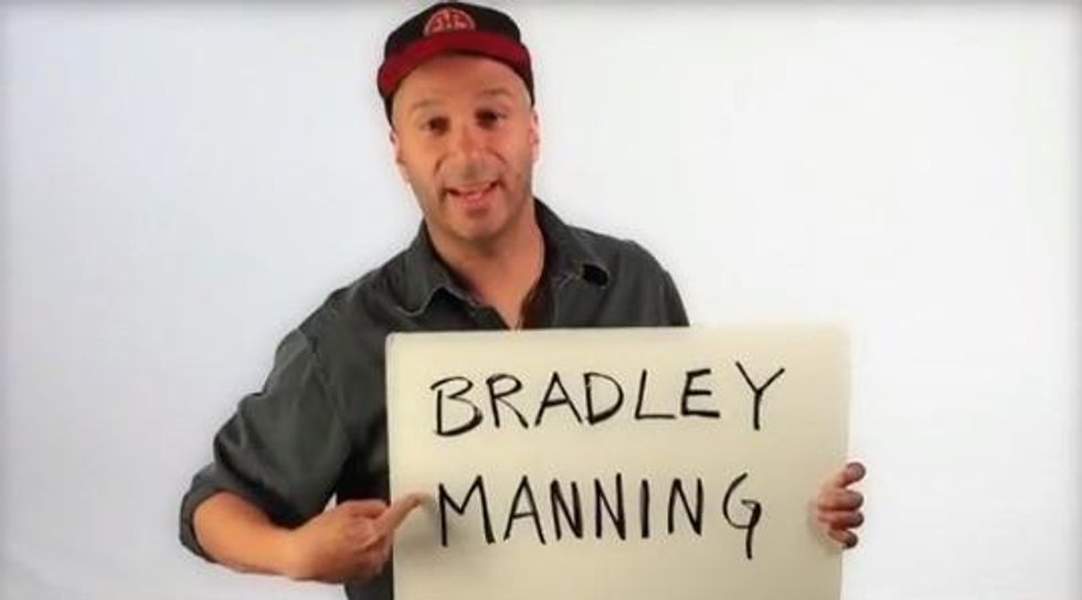Also in the video is comedian and actor Russell Brand, who made a stellar recent appearance on Morning Joe in which he shamed the co-hosts. "To take a risk and to take a stand knowing that in all likelihood you will be persecuted, penalized, demonized and punished for it, that's incredibly bold," he says of Manning's actions.
