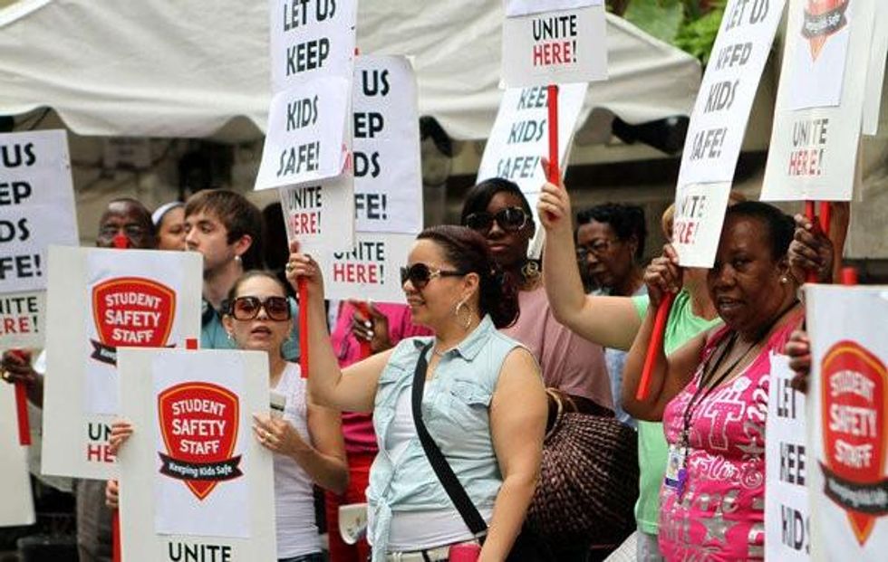 The parents and workers--joined by labor union Unite Here--are demanding a reinstatement of these aid workers, insisting that it is grossly irresponsible to erode school safety at this scale, especially at the Philadelphia's schools labeled 'dangerous' by the state education board.