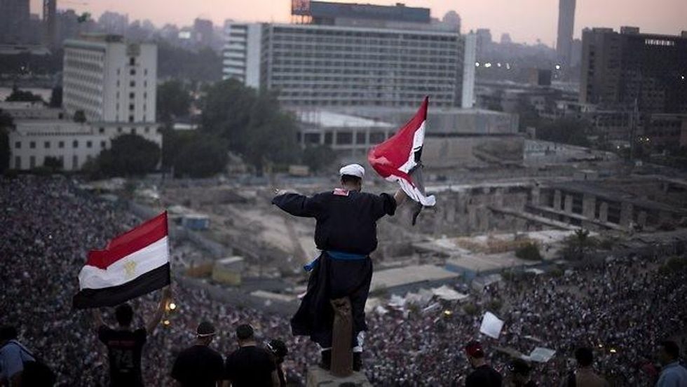 Upon hearing the army's statement on Monday afternoon, anti-Morsi protesters arrayed in Tahrir Square and outside the presidential palace, along with those in the governorates, cheered in celebration. Army helicopters hovered over Tahrir Square, throwing flags on the crowds below as they did the day before.
