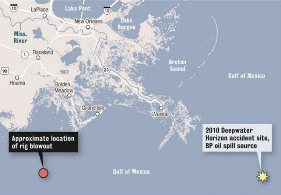 According to Jefferson Parish Council Chairman Chris Roberts, the exploded well is estimated to be about 10 miles southwest of Grand Isle, Louisiana, and there are reports of "a gas cloud in the vicinity," reports the Times-Picayune.