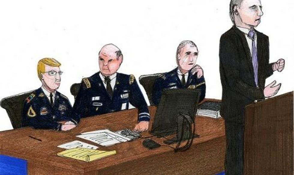 The prosecution's closing arguments on Thursday had gone on for five hours in a courtroom rife with armed military police officers patrolling the aisles. The officers "walked behind reporters trying to cover the trial yesterday...leaning over shoulders of reporters to see what was on their screens," said Gosztola. Military Judge Colonel Denise Lind had also ordered a checkpoint at the courtroom entrance to "screen the reporters to ensure that electronic devices that could be used to record proceedings and personal hotspot devices did not enter the media center."