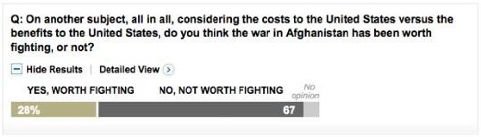 The poll asked, "Considering the costs to the United States versus the benefits to the United States, do you think the war in Afghanistan has been worth fighting, or not?" With 67 percent responding in the negative, the results reveal "a new high," reports ABC, in the 21 such polls given since early 2007.