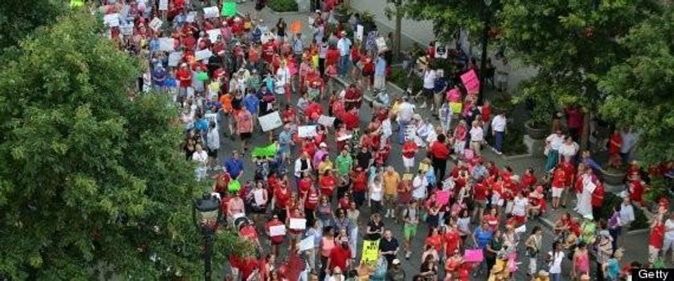 While lawmakers were absent, protesters were out in full force. In addition to the unprecedented amount of demonstrators, the North Carolina Association of Educators also brought 'busloads' of teachers to the protest, WRAL reports. Participants donned red to show their fierce opposition to a budget that ends teacher tenure, eliminates incentives for teachers with higher education degrees, provides school