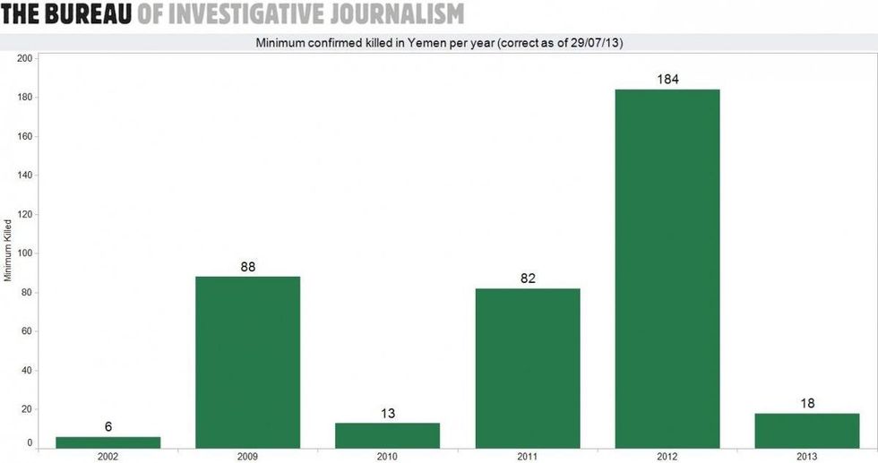 The graphic below from the London-based Bureau of Investigative Journalism shows the minimum number of people it can confirm have been killed by strikes in Yemen: