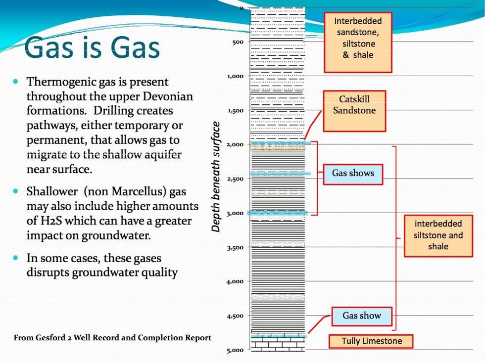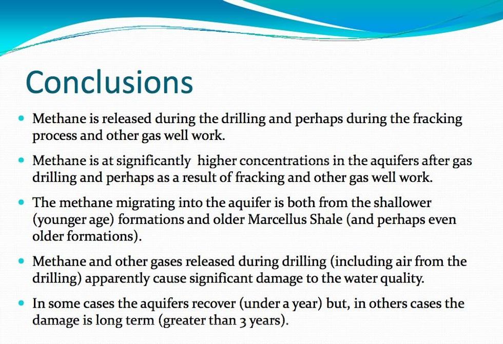 "Methane is released during the drilling and perhaps during the fracking process and other gas well work," the presentation states. "Methane is at significantly higher concentrations in the aquifers after gas drilling and perhaps as a result of fracking and other gas well work...Methane and other gases released during drilling (including air from the drilling) apparently cause significant damage to the water quality."