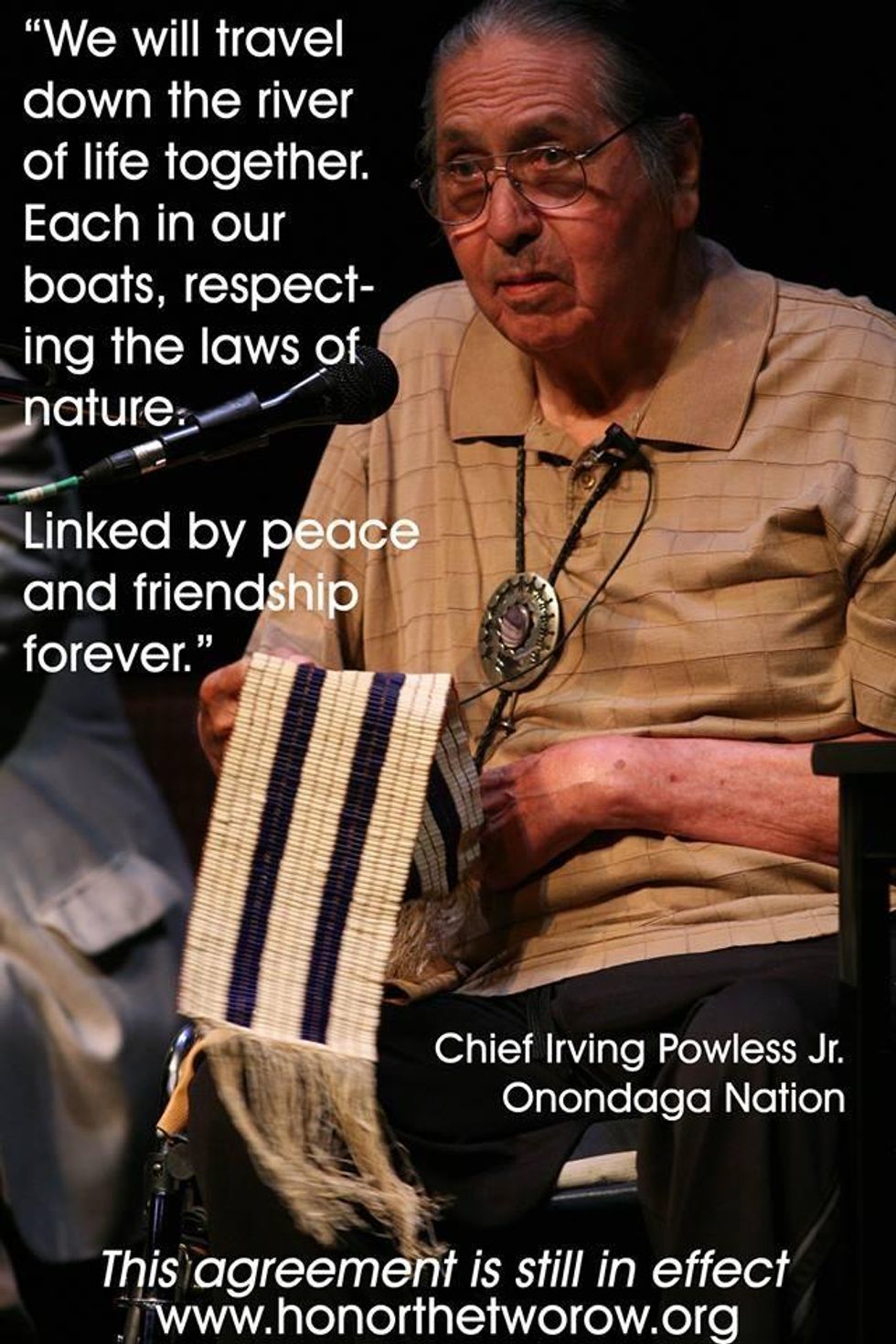 "The Two Row is the oldest and is the grandfather of all subsequent treaties," said Oren Lyons, Faithkeeper of the Onondaga Nation's Turtle Clan who has represented the Haudenosaunee in world councils at the United Nations and elsewhere. "The words 'as long as the sun shines, as long as the waters flow downhill, and as long as the grass grows green' can be found in many treaties after the 1613 treaty," Lyons said. "It set a relationship of equity and peace. This campaign is to remind people of the importance of the agreements."
