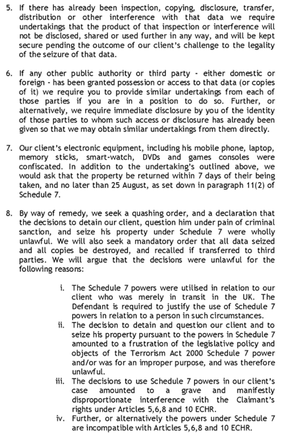The letter from his lawyers claims the detention of Miranda was for "an improper purpose and was therefore unlawful," that the decision to cite Schedule 7 "amounted to a grave and manifestly disproportionate interference with [his] rights," and that overall the British authorities were guilty of "a flagrant misuse of the [their] statutory powers."