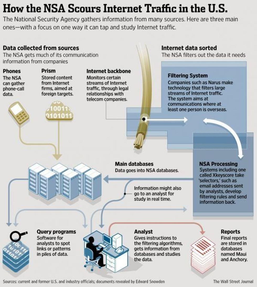 What the reporting also reveals are new details about the close relationship between the government's surveillance apparatus and private telecommunications companies that have given the NSA access to "major internet junctions" within the U.S. "The surveillance system is built on relationships with telecommunications carriers," writes the WSJ, describing how those companies "must hand over what the NSA asks for under orders from the secret Foreign Intelligence Surveillance Court."