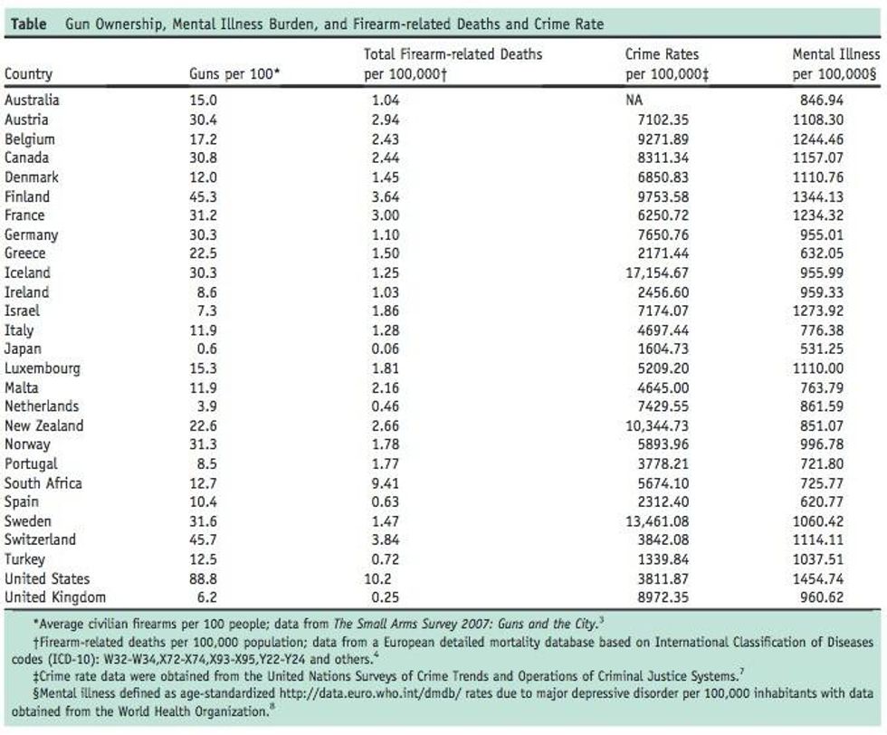 There is little question that the combination of mental illness and easy access to guns may prove to be synergistic in their lethality, as was seen in the shootings in Aurora, Tucson, at Virginia Tech, in Oak Creek, and other places in recent years. On the opposite end stands the contention that fewer firearms would reduce crime rates and overall lead to greater safety. Yet many of these arguments from both sides are based on little or no evidence. We sought to evaluate the relationship between prevalence of gun ownership and mental illness on firearm-related death in a given country.