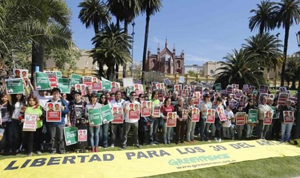 Protests were held in cities around the world on Saturday to rally support for the 28 Greenpeace activists and two journalists currently being held by the Russian government on charges of piracy.
