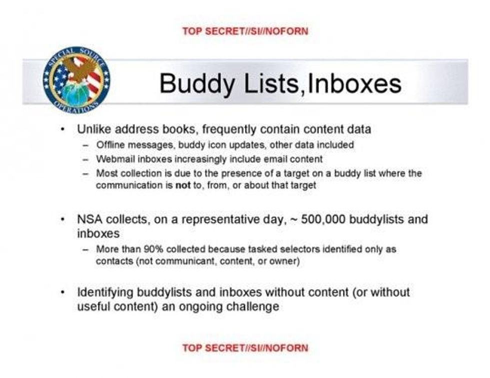 [W]hile the program is ostensibly targeted at "metadata" concerning connections between individuals, the fact that it collects "inboxes" and "buddy lists" appears to reveal content at times. With buddy lists, it can often collect content that was sent while one participant was offline (where a server holds the message until the recipient is back online), and with inboxes, they often display the beginning of messages, which the NSA collects.