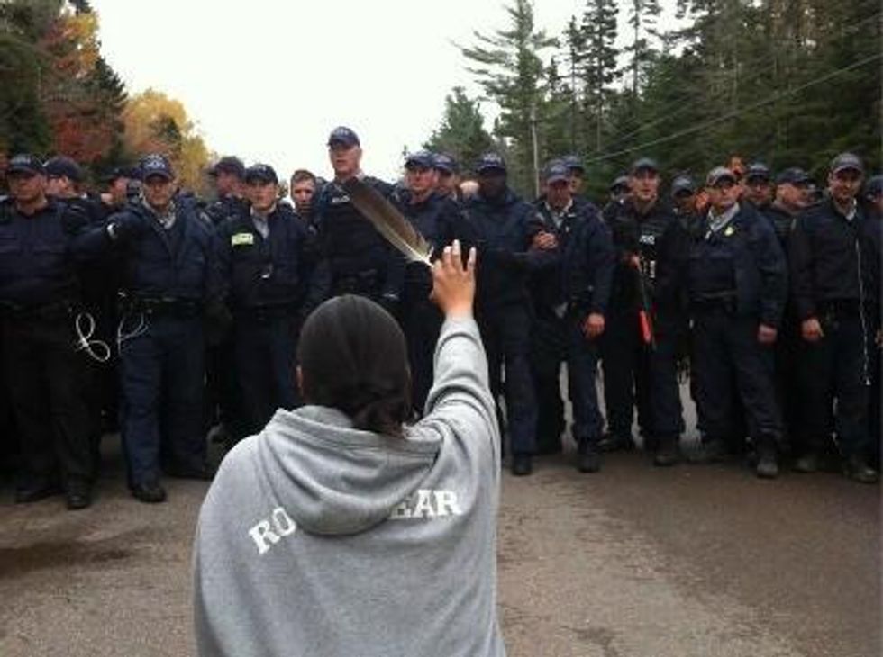 "The RCMP is coming in here with their tear gas - they even had dogs on us," Susan Levi-Peters, the former chief of the nearby Elsipogtog aboriginal reserve, told Reuters. "They were acting like we're standing there with weapons, while we are standing there, as women, with drums and eagle feathers. This is crazy." The media is reporting that some protesters threw molotov cocktails at the police, who reportedly tear gassed the crowd.
