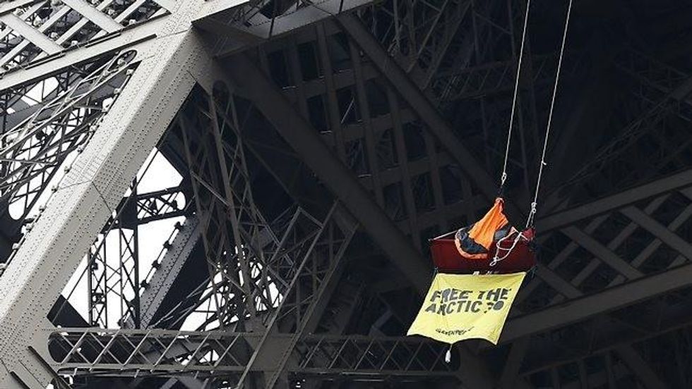 Weber's testimony was published a day after a Greenpeace activist named Patrice suspended himself from the Eiffel Tower unveiling a "Free the Arctic 30 Banner" and closing down the landmark for two hours.