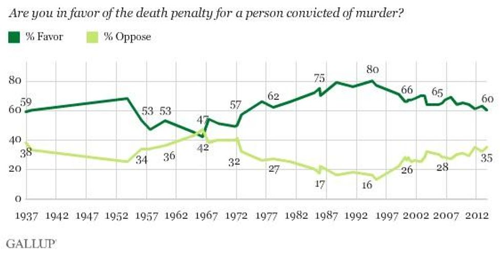 As Gallup reports, the new results show the lowest level of support measured "since November 1972, when 57% were in favor." Gallup explains that though a majority of Americans have always supported it, approval of the death penalty peaked at 80% in 1994, but has gradually declined ever since.