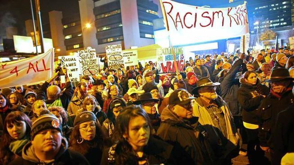 "[The name] conveys the murdered scalps of indigenous people -- men, women and children," Alan Yelsey, who identified himself as an organizer for the American Indian Movement, told the Washington Post. "And that name is just a horrendous name for all of these people and for anybody of color... we're raising up and saying anybody who denigrates any class of people like that needs to be stopped."