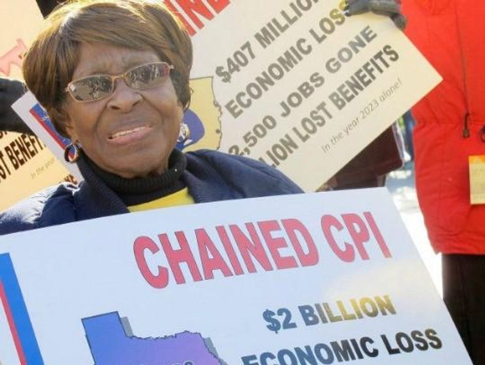 "We're here to tell every politician, Republican or Democrat, peel away from your leader if you need to," Terry O'Neill, president of the National Organization for Women, told the crowd. "Do not go along with the Chained CPI [...] because you will pay a price at the polls."