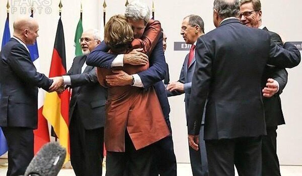 President Obama and Secretary of State Kerry signed the deal in explicit, full-frontal defiance of American hawks, neoconservatives and hardliners, the Israel lobby, and anti-Iran partisans in Congress. Foreign Minister Javad Zarif and his team, backed by President Hassan Rouhani--elected in June with a mandate to do exactly this--have similarly defied their own country's hardliners and skeptics, led by the Islamic Revolutionary Guard Corps and by what Zarif calls Iran's own Tea Party. And the United States struck the deal despite outright hostility, bordering on hysteria, from its two chief allies in the Middle East, Israel and Saudi Arabia. [...]