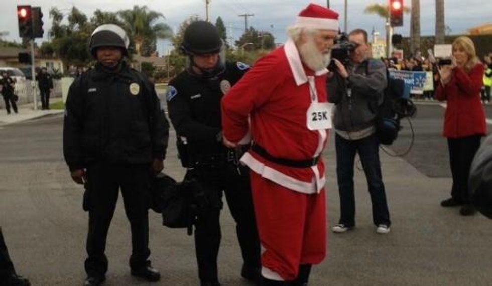 At a protest outside a Walmart store in Ontario, California on Friday morning, a group of worker advocates, including a man dressed as Santa Claus, were arrested for blocking traffic as they demanded attention for the plight of Walmart employees, store contractors, and their families.