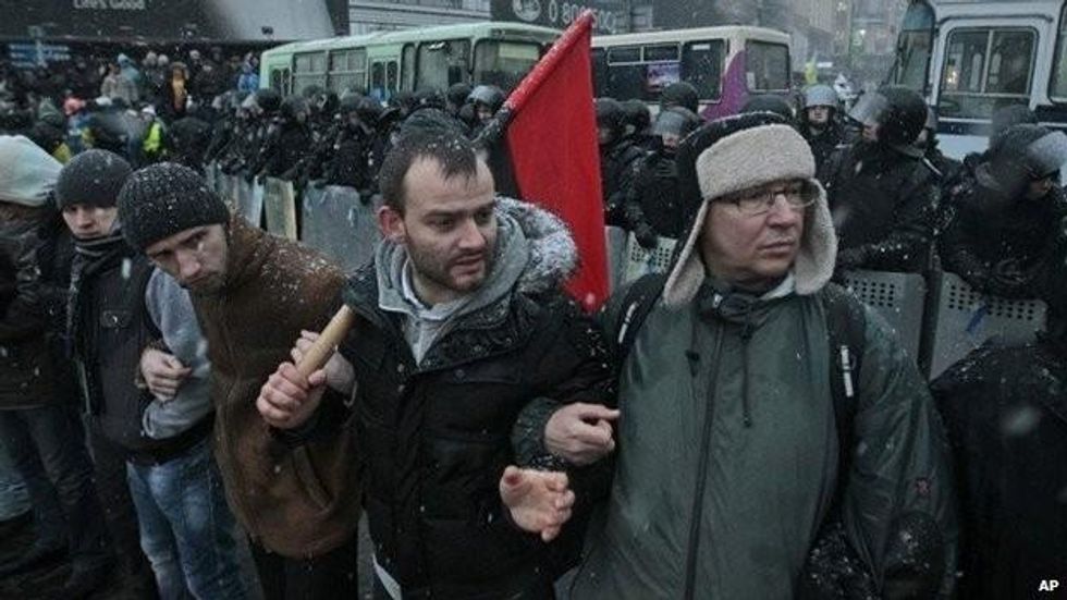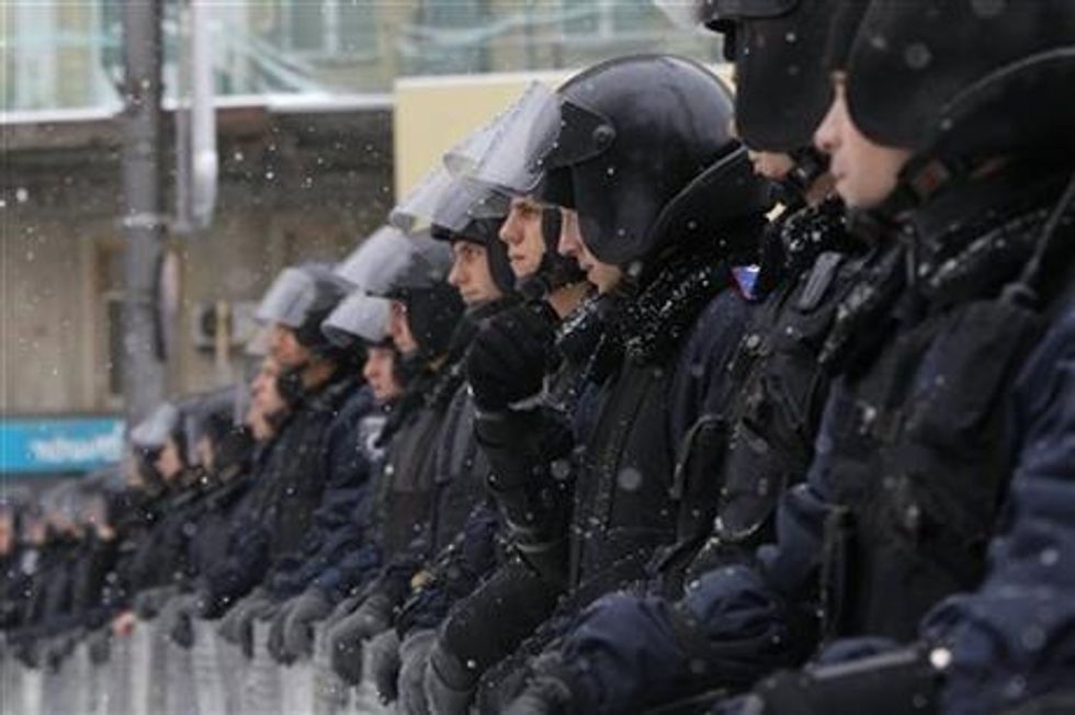 The action came after Kiev was flooded with hundreds of riot police in full gear. Some police surrounded opposition tents erected outside government buildings and began dismantling the barricades blocking people from city offices.