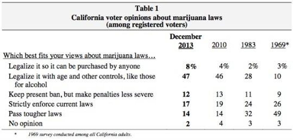 The nonpartisan pollsters note that the latest poll indicates a "huge reversal of public sentiment toward marijuana" with just 31 percent favoring strict enforcement of existing laws or passing tougher sanctions, compared with 75 percent of poll respondents in 1969.