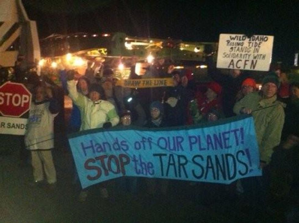 Monday's blockade follows a similar action earlier in the month, when Rising Tide activists and Umatilla tribal members blockaded a megaload of tar sands equipment near the Port of Umatilla in Oregon. In August members of the Nez Perce tribe and others halted a similar megaload of equipment making its way along Idaho's Highway 12 to the Alberta tar sands fields.