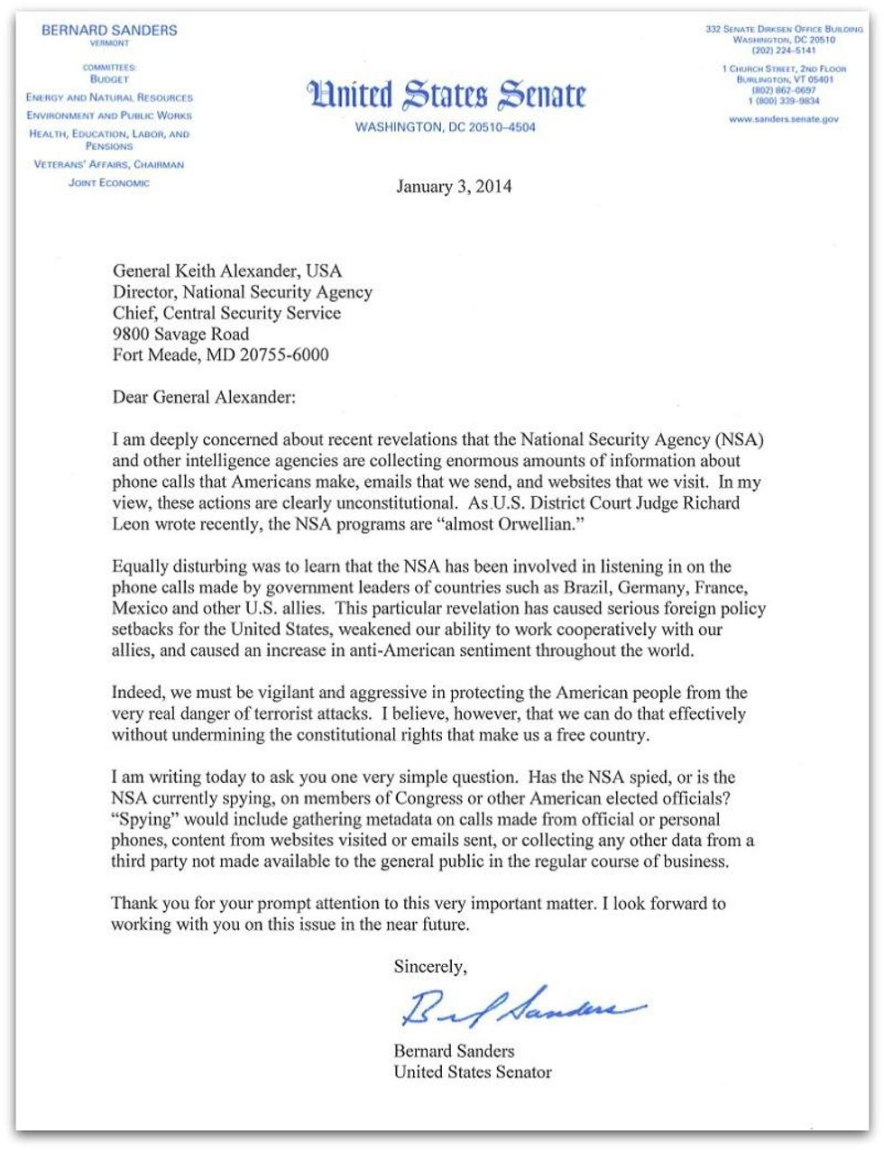 "I am writing today to ask you one very simple question," wrote Sanders in the letter addressed to Gen. Alexander. "Has the NSA spied, or is the NSA currently spying, on members of Congress or other American elected officials?"