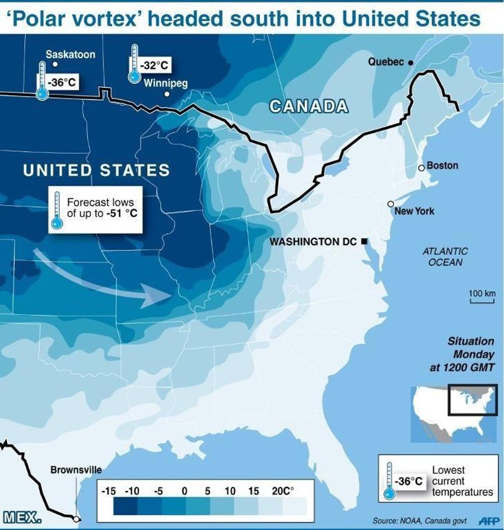 Sadly and predictably, however--as much of the nation faces the coldest temperatures seen in nearly two decades on Monday and into Tuesday-- the push of bone-chilling arctic air into southern Canada and much of the United States has the climate change denialists pushing their familiar falsehoods about how near-record lows nationwide somehow disproves global warming.