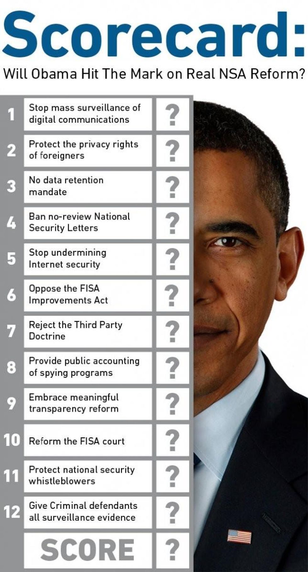 As part of their effort to hold Obama accountable and articulate their critique of NSA overreach, the online privacy and digital rights groups Electronic Frontier Foundation has created a "NSA Reform Scorecard" that presents a list of "common-sense fixes that the President could--and should--announce" during Friday's briefing.