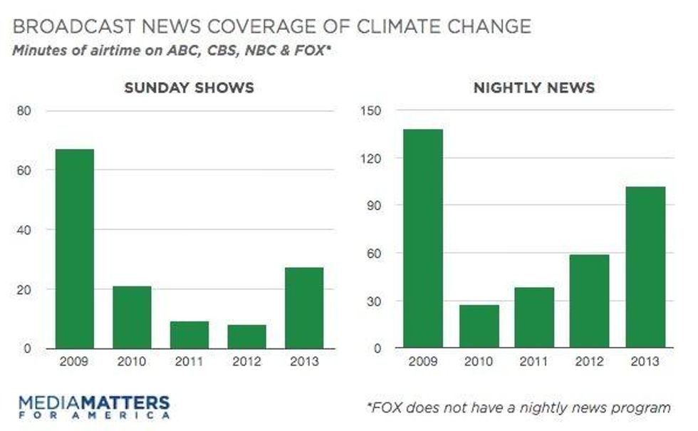 And on the networks' political weekend shows? "Out of a year's worth of coverage, the Sunday shows focused on climate change for 27 minutes, the most aired since 2009."