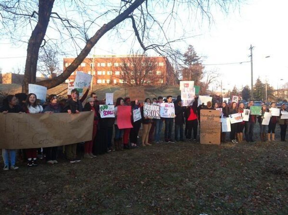 Nearly 100 students at Central High School -- where Corbett was slated to make his appearance -- rallied in front of their school at 7:30 AM, chanting "No Education, No Life," and "Save Our Schools," waving banners and posters and passing out informational flyers to parents and students entering the building.