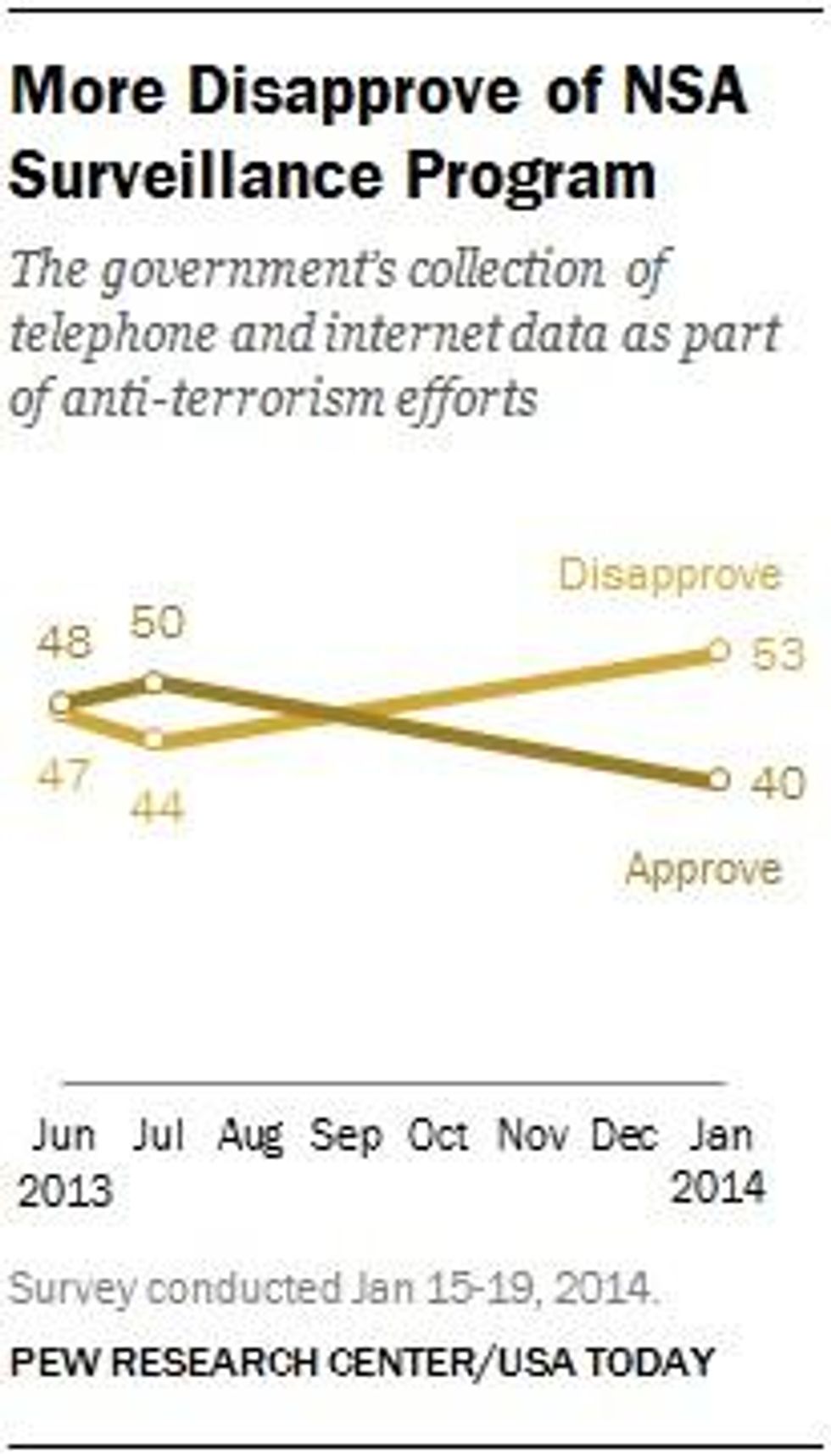 The poll, which surveyed 1,504 adults, found that 53% disapprove of the U.S. government's surveillance of telephone and internet data, while just 40% approve. This is a marked shift from July, when more than 50% said they approved and only 44% said they disapprove.