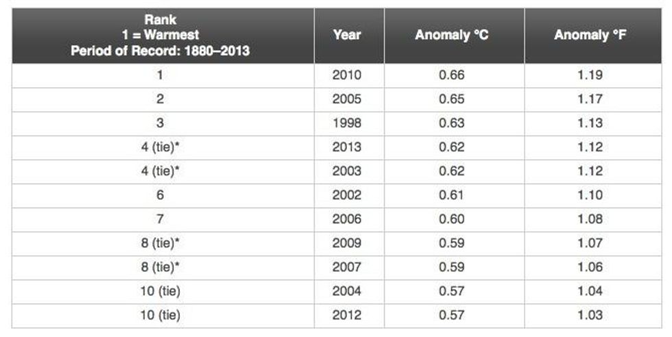 2013 tied for the world's fourth warmest year on record, according to calculations by the National Oceanic and Atmospheric Administration.