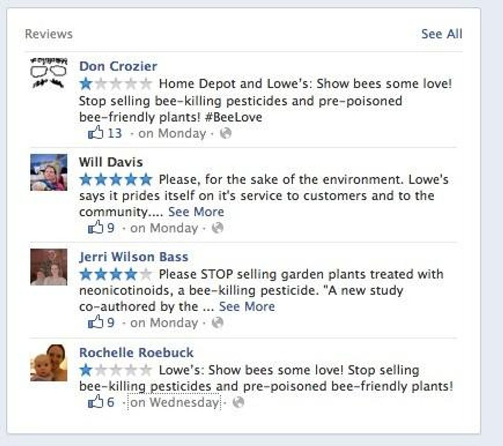 The campaign urges consumers to also call the stores' corporate offices to make their voices heard there as well. Another tactic the campaign suggests is leaving a message on the Facebook pages of the Home Depot and Lowe's with a bee-saving message. A few of the messages people have left can be seen below: